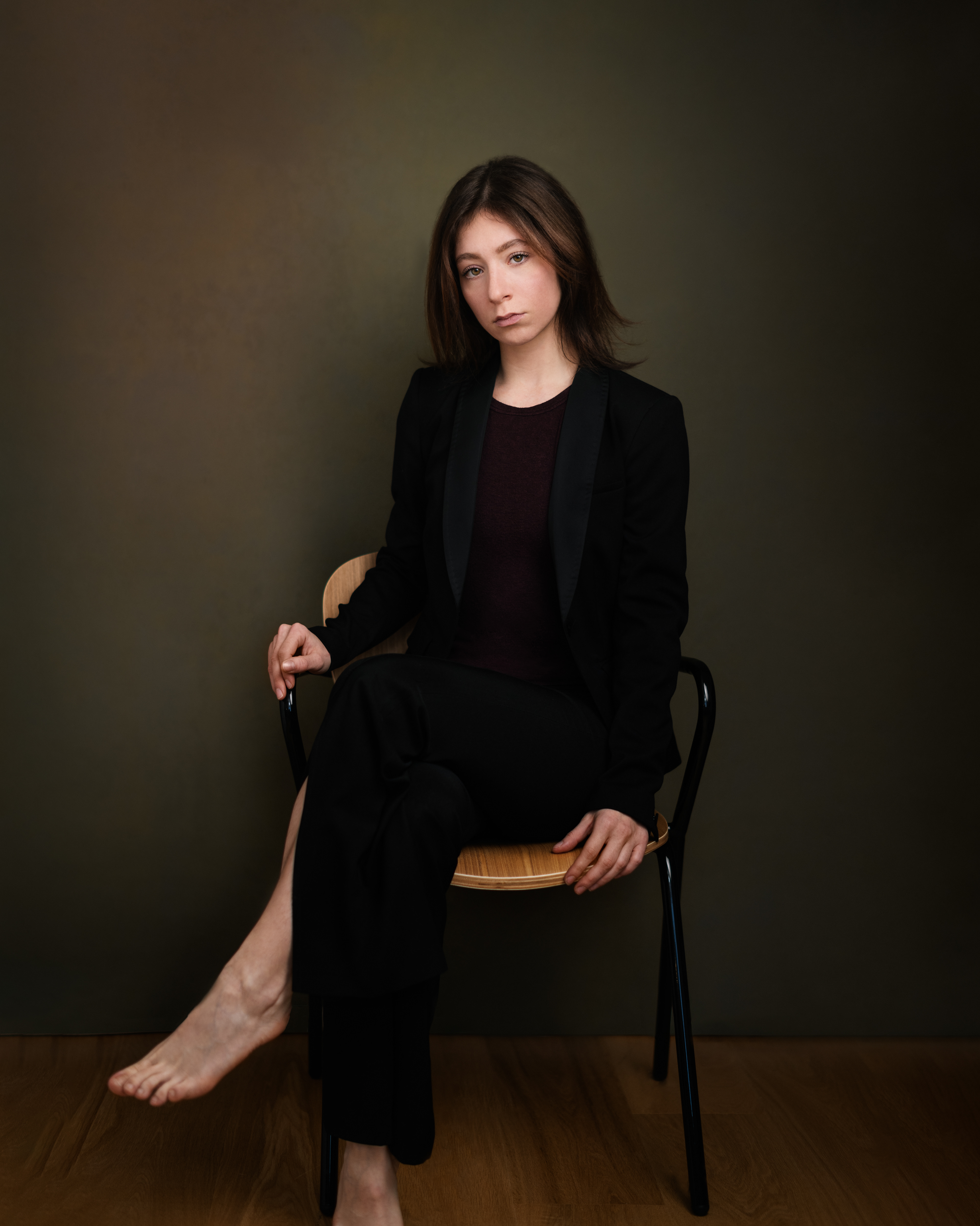 Shoot with Léa in the studio in Braine-l'Alleud. Léa is an actress who works in the theater and is also looking for film roles. She is young and very talented. Léa has a very special look that makes her stand out, sets her apart. I learned that body comes before mind on the scene, maybe we photographers overthink everything indeed. We did a rather elegant and fashionable shoot that shows a different angle in her book. Used a slight colour grading with purple (lower left) and orange (upper right) accents which I think works well with the purple top and khaki background.